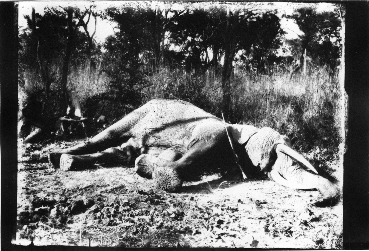 'Diverse fotografier från bl.a. dåvarande Nordrhodesia, nu Zambia, tagna av Konsul Magnus Leijer. :: :: En fälld elefant liggande på sidan med ett gevär lutat mot kroppen. Bakom kroppen sitter tre män'