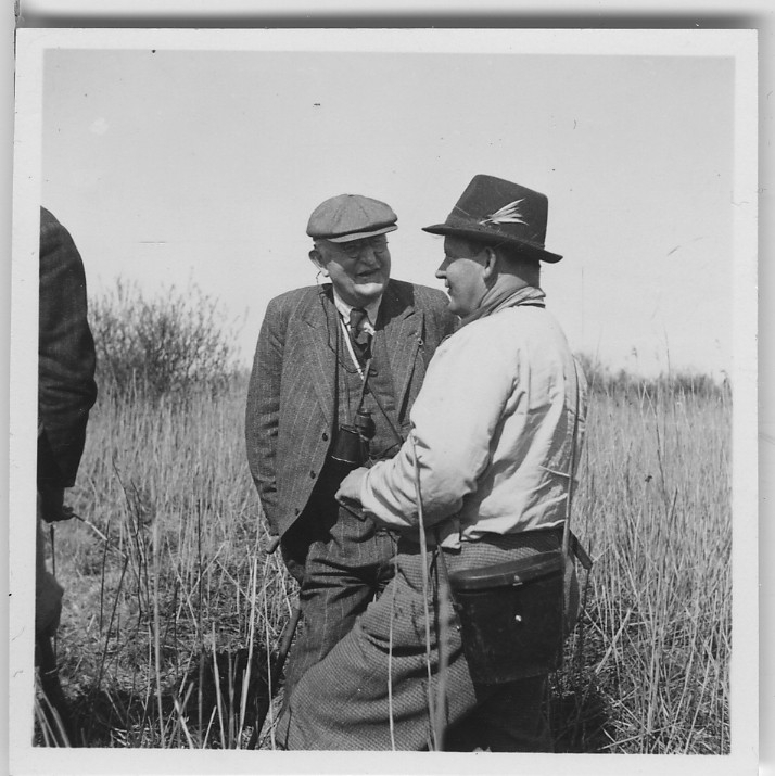 'Från Biologiska Föreningens utfärd till bl.a. Ivö i nordöstra Skåne: :: :: Professor Leonard Axel Jägerskiöld (t.v.) och Amanuens Nordquist (t.h.) står och samtalar på Nymö mosse. Delar av ytterligare en person är synliga. Fjäderprydd hatt. Kikare. Hörapparat. :: :: Se fotonr. 4119:1-11 och 4120:1-10 från samma utfärd. Fotonr.'