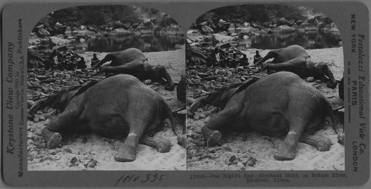 'Elefantjakt vid Rekuse river. 2 döda elefanter och en grupp människor som sitter på marken. :: ''17010- One night´s Bag -elephant hunt, on Rekuse river, Rhodesia, Afrika.'' :: :: Ingår i serie med fotonr. 315-422.'