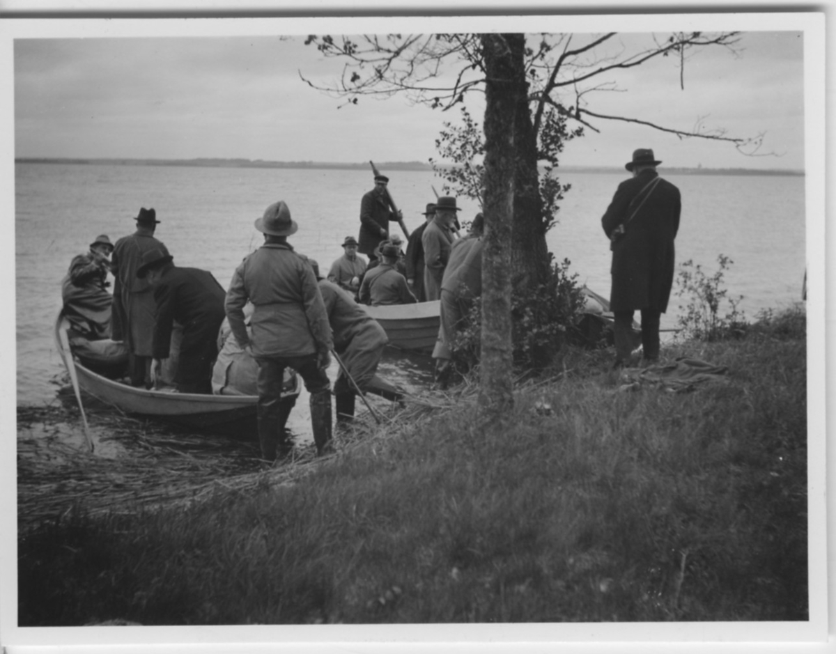 'Biologiska föreningens utfärd till Tåkern, Vadstena m.fl. platser: :: :: Gruppen av ca 13 män i och vid 2 ekor som dras upp på sjöstranden. Vy ut mot sjön. :: :: Se fotonr. 3588-3634 samt 3661-3677.'