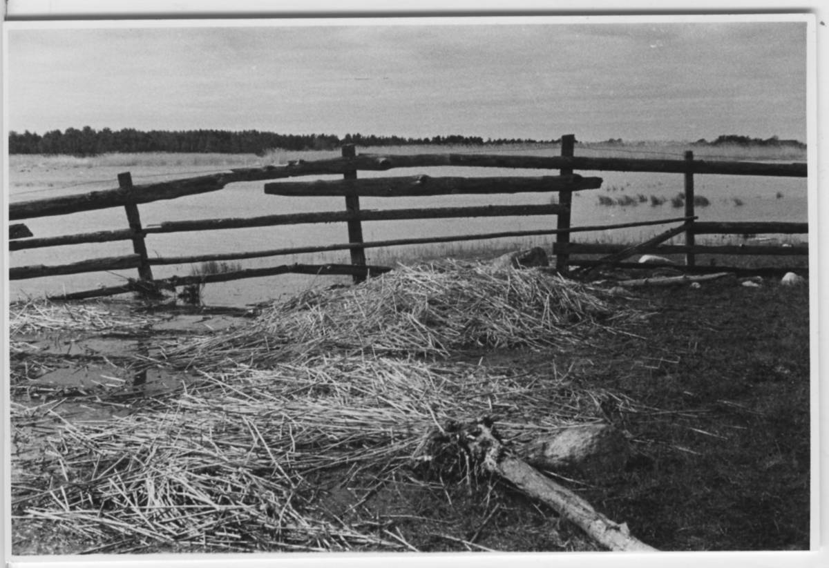 'Biologiska föreningens utfärd till Tåkern, Vadstena m.fl. platser: :: :: Svanbo liggande på marken framför trähägnad, i bakgrunden sjön Tåkern. :: :: Se fotonr. 3588-3634 samt 3661-3677.'
