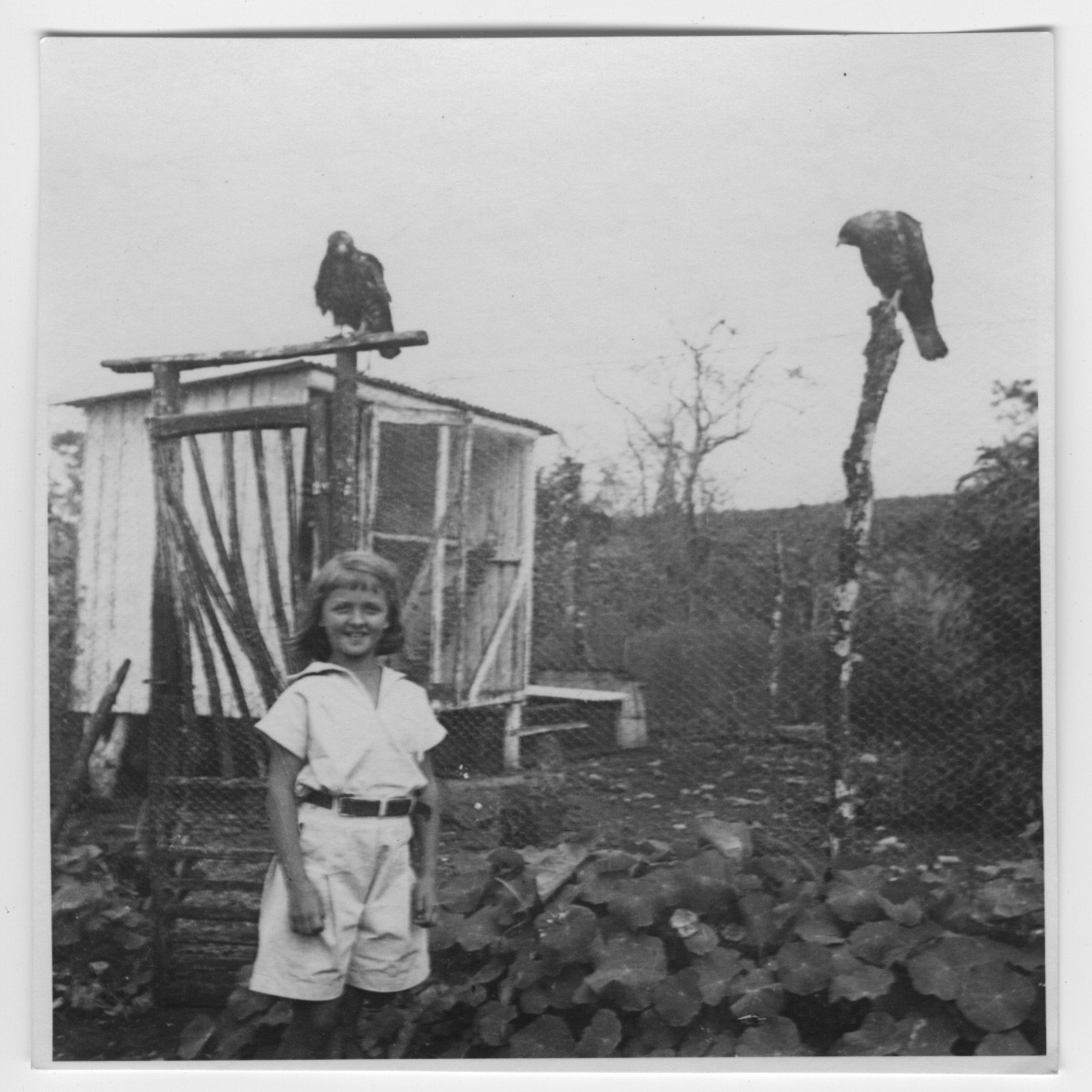 '2 vilda galápagosvråkar betraktar Gloria Lundberg, barn till en svensk nybyggare på Ganta Cruz :: :: Se serie med fotonr. 3779-3822.'