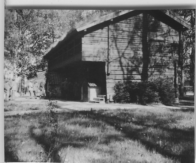 'Biologiska Föreningens utfärd till Oset och Kvismaren: :: :: Knuttimmrat hus med gruppen av män spridd vid sidan om. I förgrunden gräs. Fotograferat från avstånd. :: :: Ingår i serie med fotonr. 4386:1-18.'