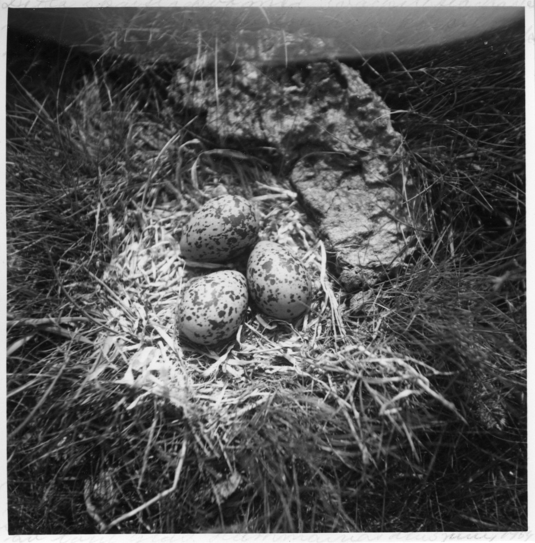 'Enligt anteckning på fotografiets baksida: :: ''Detta skärfläcksbo med tre vackert fläckade ligger invid en torr halv koskit: en egendomlig lokal för bobyggande. Bilden togs på 33 cm avstånd. Som synes av fotografiet består reden av torrt gräs.'' :: :: Ingår i en serie med fotonr. 4512:1-57 med diverse foton av fågelbon med ägg och ungar. Varje fotografi har utförliga anteckningar på sin baksida, kopierade från framsidan, spår av de på framsidan är fortfarande synliga.'