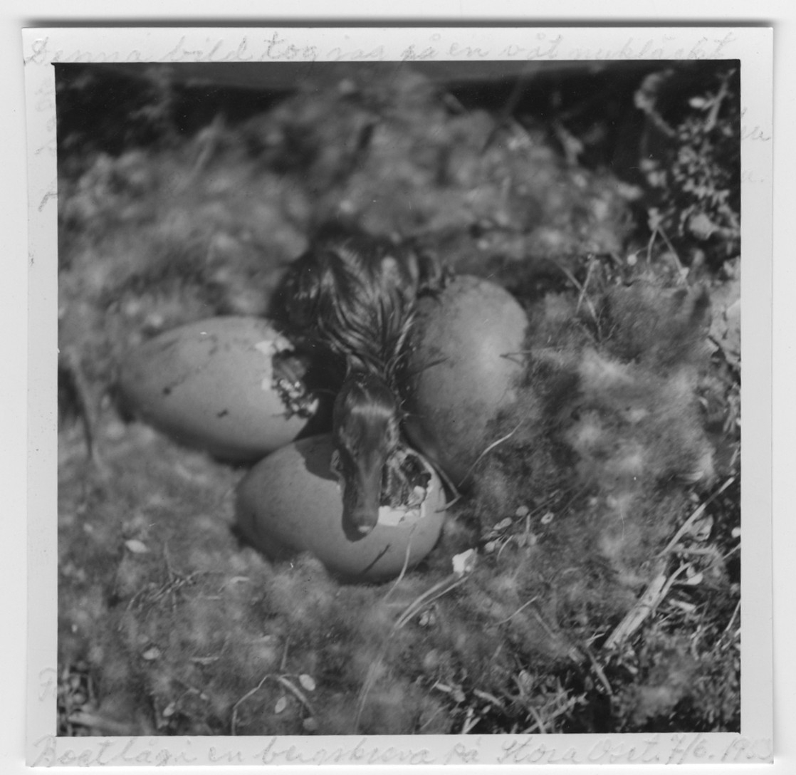 '1 nykläckt ejderunge och 2 ägg under kläckning. Dun i boet. :: :: Ingår i serie med fotonr. 4545:1-34.'
