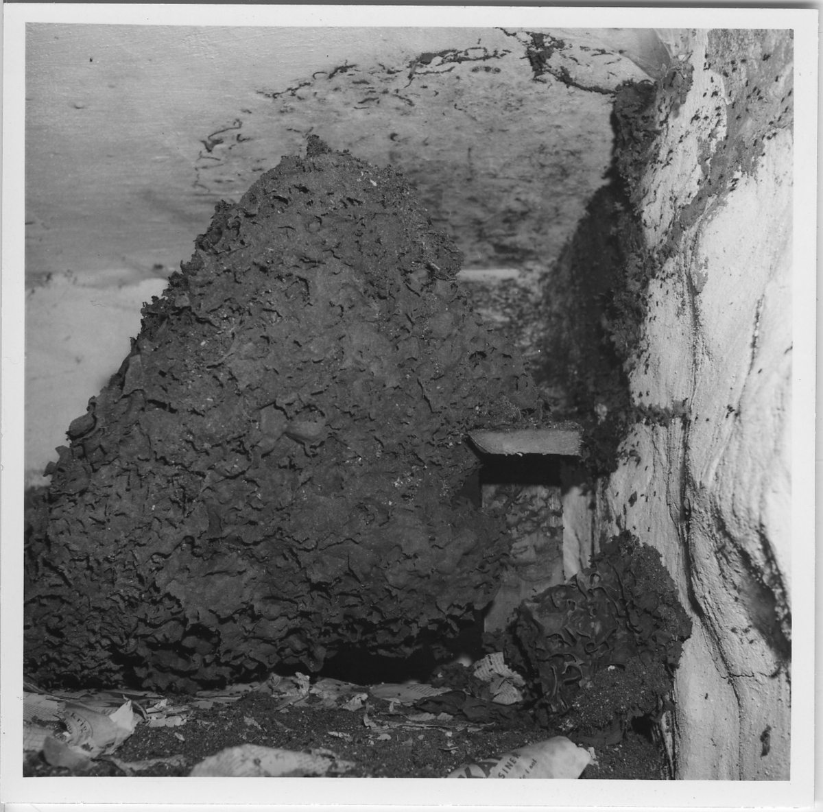 'Foton av jättebo av blanksvart trädmyra, närbild på boet. I taket och på väggen till höger framträder spår efter boets kittytor. Boet är ett pergamentsbo med storleken, 55 cm högt, bredd 55 cm, längd i horisontalplan 63 cm och vikt 6 kg. :: :: Serie fotonr 4716-4729, se även fotonr. 5086:1-9. Samma motiv som fotonr. 5086:5.'