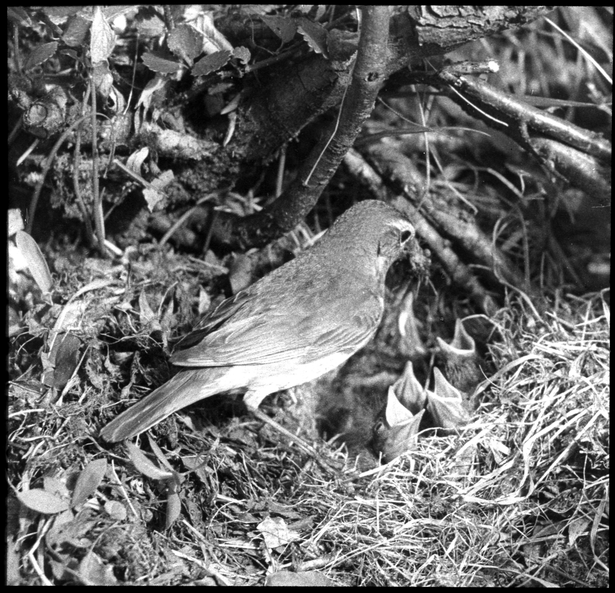 'Bildtext: ''Blåhake, hona, med mat, hos ungarna.'' Blåhake i boet med ca 5 ungar, med näbbarna öppna. Närbild. Boet intill stammen av en buske. :: :: Ingår i serie med fotonr. 5156:1-10 numrerade med bildnr 110-119. Se även hela serien med fotonr. 5155-5174.'