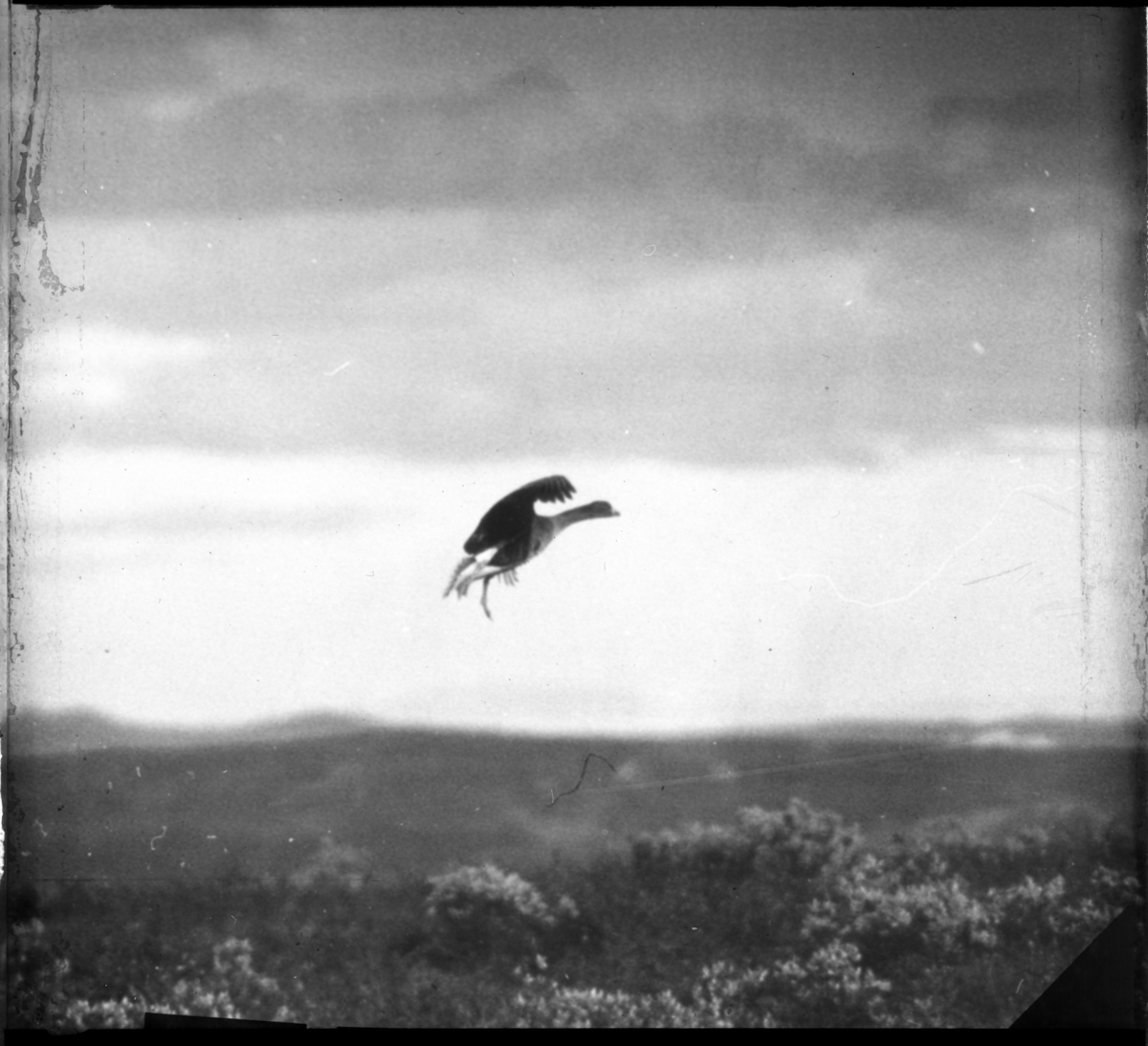 'Bildtext: ''Fjällgås slår ned på boet.'' Vy över terrängen där fjällgåsen har sitt bo, ris- och buskvegetation. Fågeln på väg att landa. :: :: Ingår i serie med fotonr. 5171:1-8, numrerade med bildnr 263-270. Se även hela serien med fotonr. 5155-5174.'
