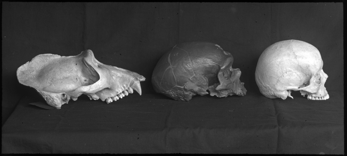 '3 kranium av från vänster gorilla, neandertalare och människa liggande intill varandra, sedda från sidan. Bilden numrerad II.A. Nr. 5. :: :: Ingår i serie med fotonr. 5376:1-20, bilder från Dr. Schlüter & Mass naturvetenskapliga läromedel, Halle a S. Serie II.A. Nr 1-20. Se även hela fotoserien 5374-5376.'