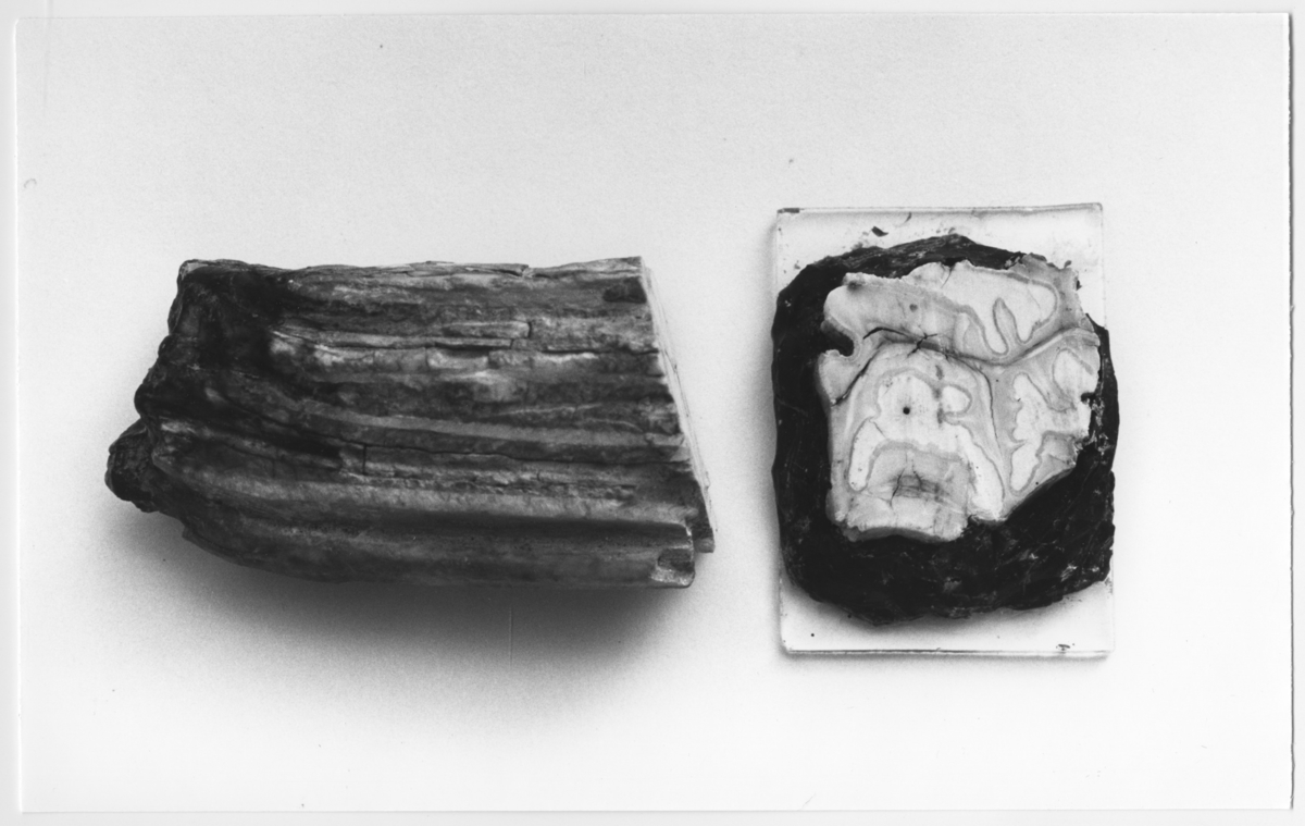 'Närbilder på tand, snitt samt sedd från sidan. Tand, 2:a eller 1:a molaren i höger överkäke. :: :: Ingår i serie med fotonr. 5634:1-6.'
