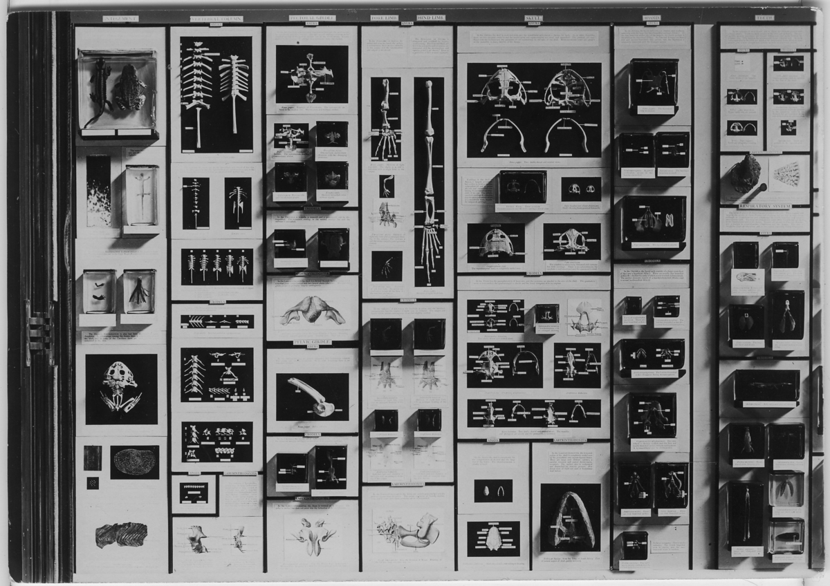 'Div. bilder på ''museala arrangemang av fåglar'', bilderna är insamlade av Leonard Axel Jägerskiöld. :: :: Utställda amfibier. Skelett, kroppsdelar, hela kroppar etc. Enligt anteckning på baksidan av fotografiet: ''amphibians, wall case in one of the bays of the bay.'''