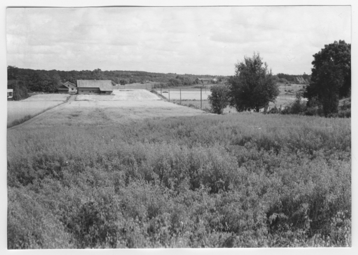 'Bildtext: ''Sedimentyta. Riktning 98.'' :: Vy över öppna fält, åkrar och på avstånd gårdar, hus. Sädesfält. :: :: Ingår i serie med fotonr. 6970:1-1125, dokumentation av Hisingens naturgeografi, visande landskapsformerna i stora drag och gjord inför exploateringen av området. Platserna för fotograferingen finns utsatta på karta i skala 1:4000 som finns på Göteborgs Naturhistoriska musem. Fotoriktningen mättes med kompass i gammalgrader.'