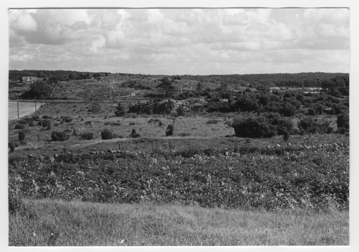 'Bildtext: ''Beteshage i hällandskap. Riktning 86.'' :: Vy med beteshage med enbuskar och på avstånd hus och kala berghällar. Stenmur. Stengärdesgård. :: :: Ingår i serie med fotonr. 6970:1-1125, dokumentation av Hisingens naturgeografi, visande landskapsformerna i stora drag och gjord inför exploateringen av området. Platserna för fotograferingen finns utsatta på karta i skala 1:4000 som finns på Göteborgs Naturhistoriska musem. Fotoriktningen mättes med kompass i gammalgrader.'