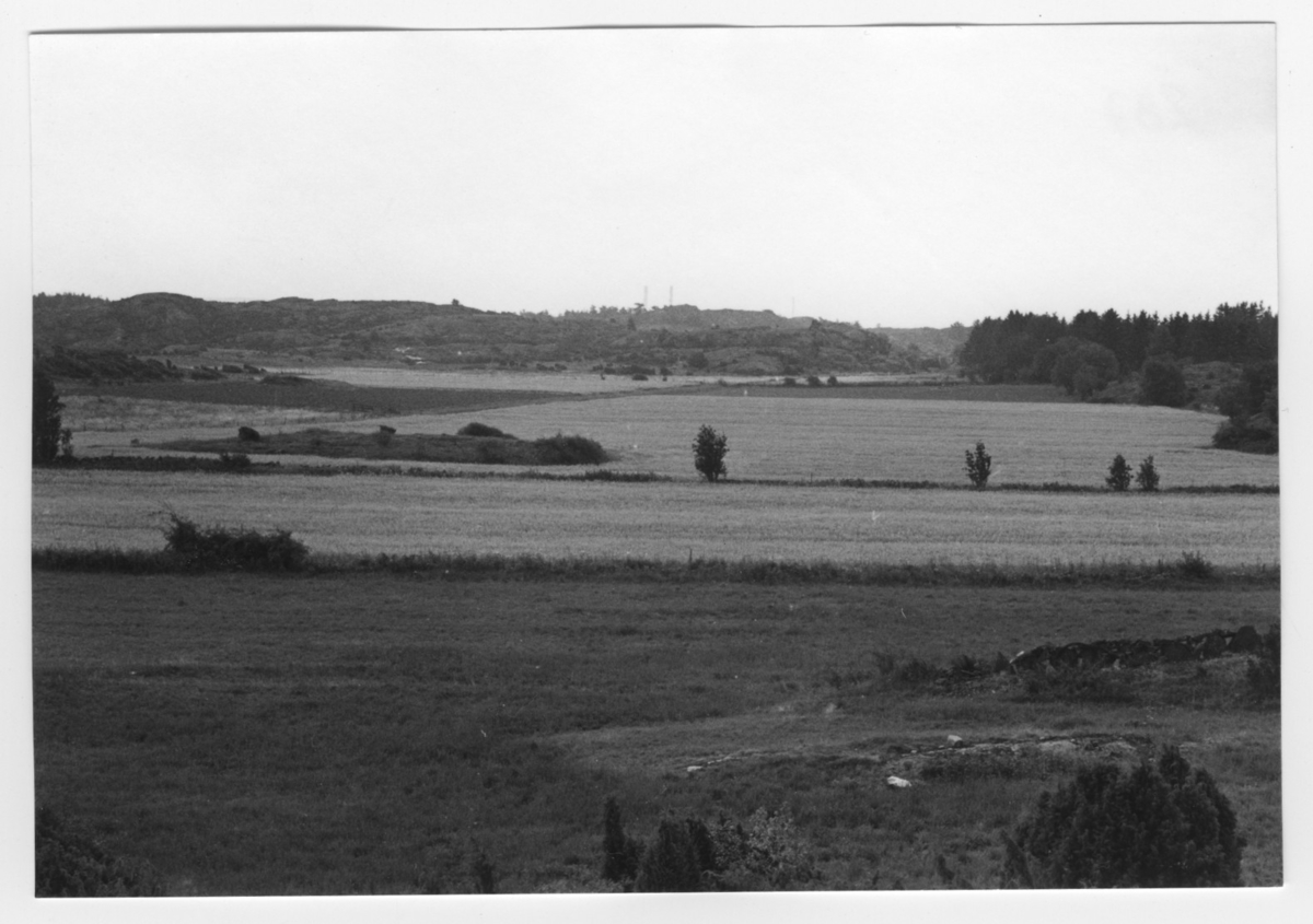 'Bildtext: ''Sedimentyta. Riktning 170.'' :: Vy över öppna fält, åkrar. :: :: Ingår i serie med fotonr. 6970:1-1125, dokumentation av Hisingens naturgeografi, visande landskapsformerna i stora drag och gjord inför exploateringen av området. Platserna för fotograferingen finns utsatta på karta i skala 1:4000 som finns på Göteborgs Naturhistoriska musem. Fotoriktningen mättes med kompass i gammalgrader.'