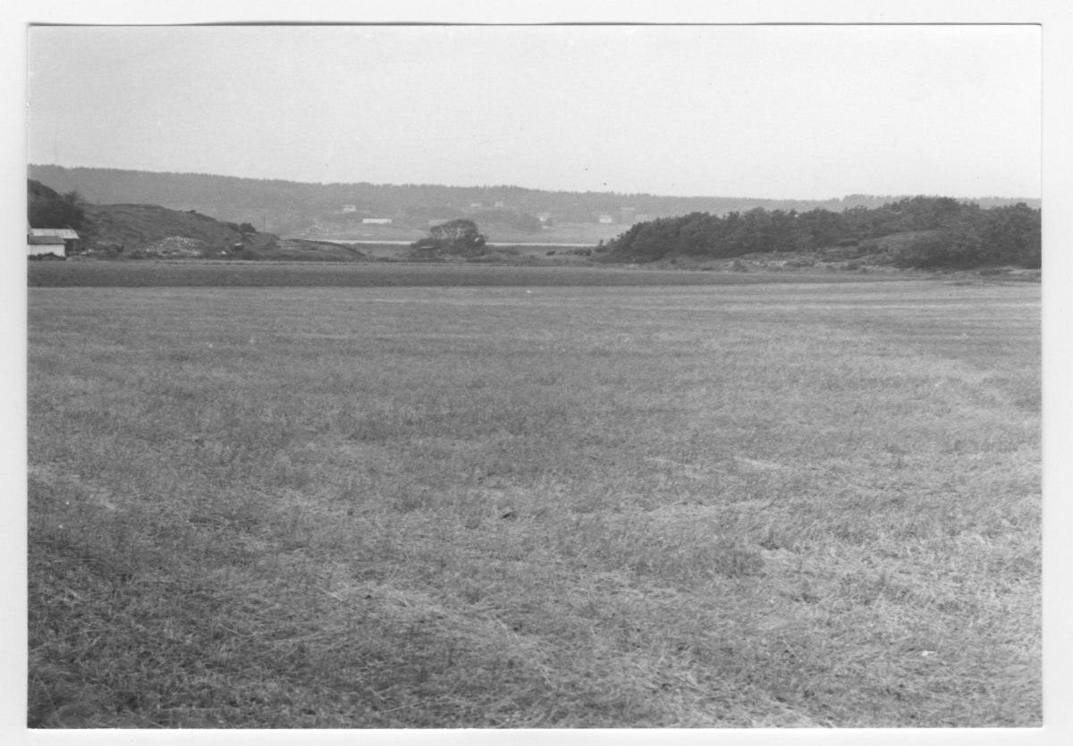 'Bildtext: ''Sedimentdalgång. Riktning 320.'' Vy över öppna fält, åkrar. Hus på avstånd. :: :: Ingår i serie med fotonr. 6970:1-1125, dokumentation av Hisingens naturgeografi, visande landskapsformerna i stora drag och gjord inför exploateringen av området. Platserna för fotograferingen finns utsatta på karta i skala 1:4000 som finns på Göteborgs Naturhistoriska musem. Fotoriktningen mättes med kompass i gammalgrader.'