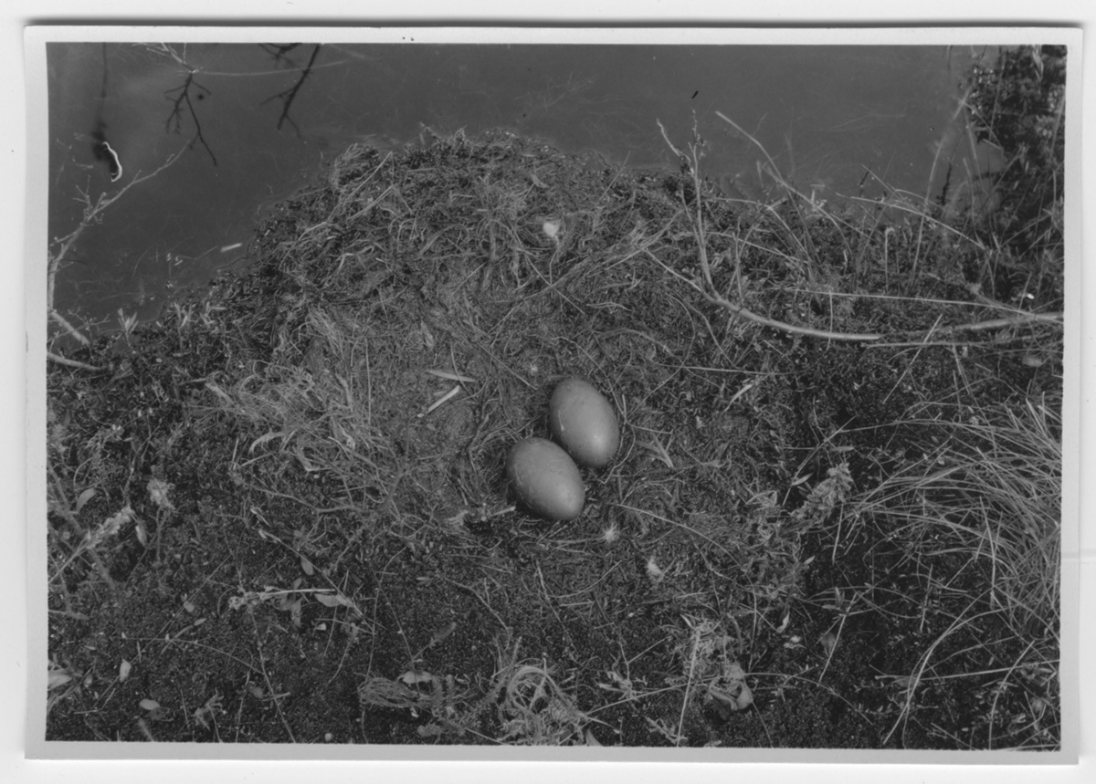 'Smålom, bo med 2 ägg, i en tjärn i Hindåstrakten. Närbild på boet intill vattenkanten. Se även fotonr. 1328. :: :: Se serie med fotonr. 1305-1356.'