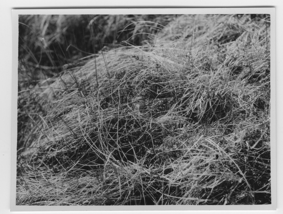 'Grönbena, på boet i högt gräs. Sedd från sidan. :: :: Ingår i serie med fotonr. 2116- 2160.'