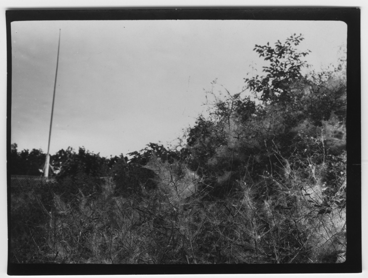 'Vy med angripna slånbuskar. Text på baksidan: ''Inspinning av häggspinnmal på slånbuskar.'' :: :: Ingår i serie med fotonr. 2347-2399.'
