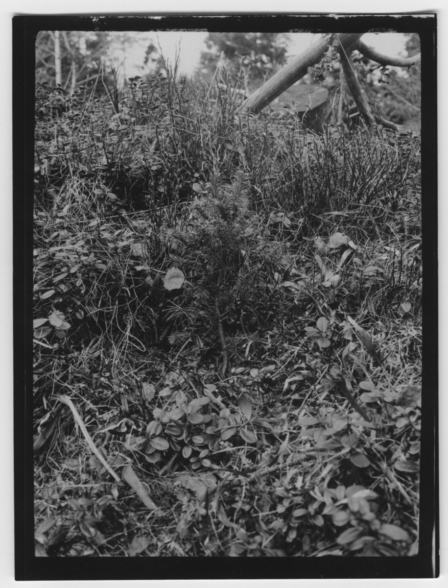 'Granplanta. Text på baksidan: ''Granplanta med av tjäder avbitna skottspetsar.'' Bl.a. lingonris omkring. :: :: Ingår i serie med fotonr. 2347-2399.'