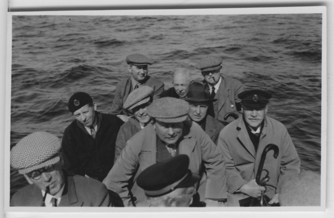 'Biologiska föreningens utfärd till Läsö och Nordre Rönner: :: :: 10 st män, gruppen, sitter antagligen i en båt, vatten omkring. Närbild. Leonard Axel Jägerskiöld längst bak till höger. :: :: Se fotonr. 2674-2734, 2687-2691, 2692-2711, 2714-2734, 2843-2863 och 2975 från samma utfärd.'