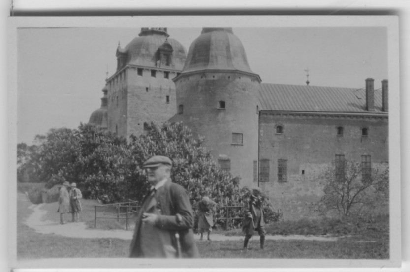 'Biologiska föreningens utfärd till Öland. :: :: Text enligt foto: ''Kalmar slott. Leonard Axel Jägerskiöld i förgrunden.'' I bakgrunden del av slottet samt 4 st personer. :: :: Se även fotonr. 2607-2625, 2583-2606 samt 2883-2911 från samma utfärd.'