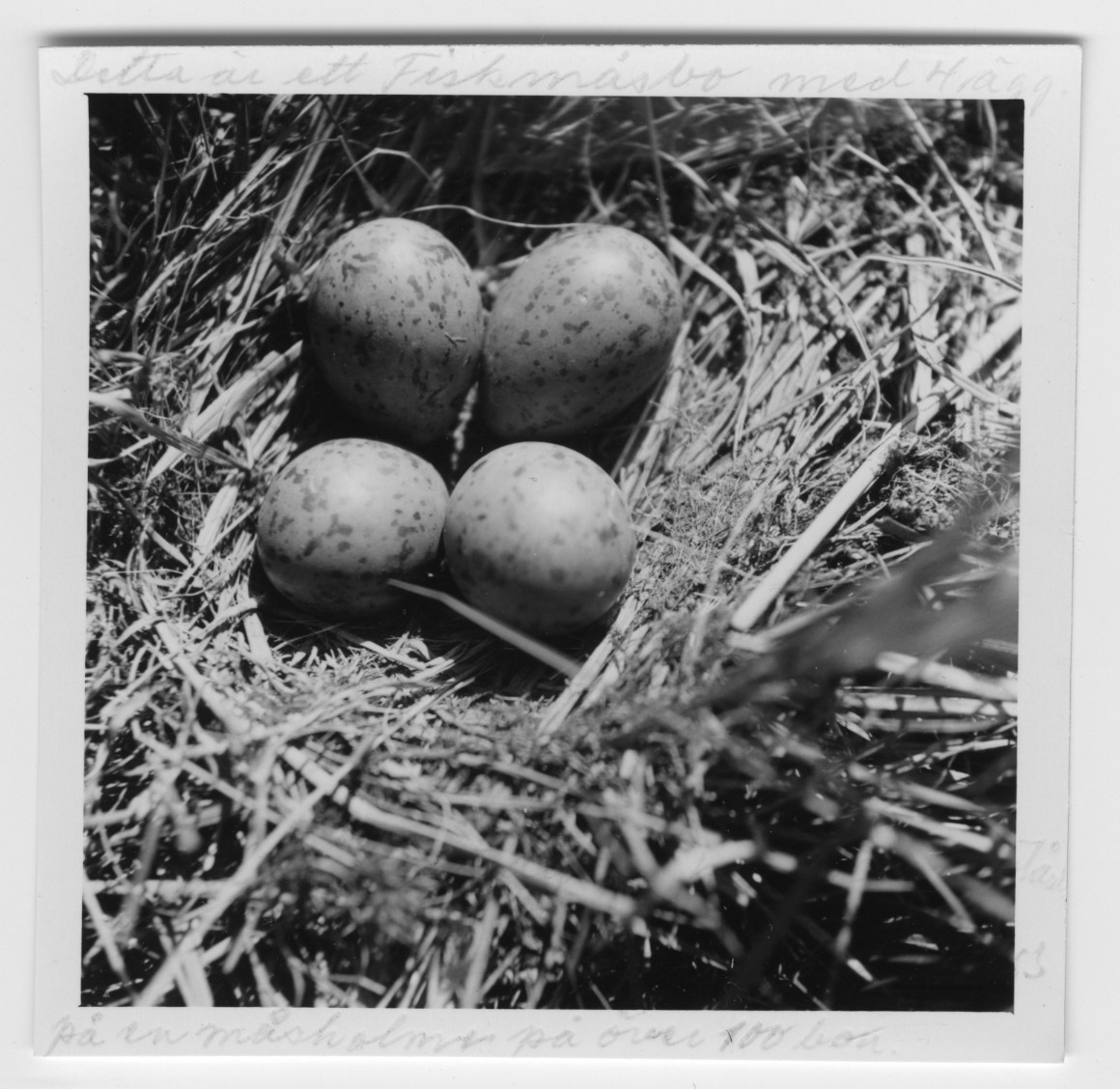 'Bo med 4 fiskmåsägg. :: :: Text på fotot: ''Detta är ett fiskmåsbo med 4 st ägg. Bilden är tegen på 33 cm avstånd på en måsholme med över 100 bon.'' :: :: Ingår i serie med fotonr. 4545:1-34.'