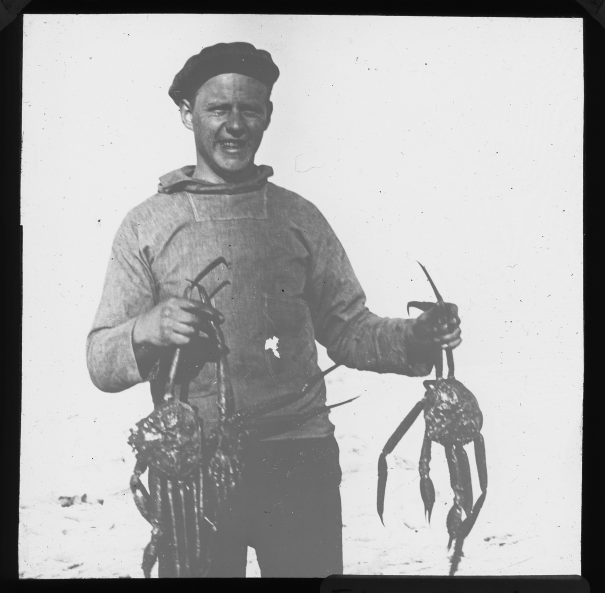 '1 man med 3 krabbor i händerna. Kläder. Klädsel. :: :: Ingår i serie med fotonr. 5212:1-8, se även fotonr. 5217:1-98. Se även hela fotonr. 5202-5218 med bilder från Frits Johansen.'