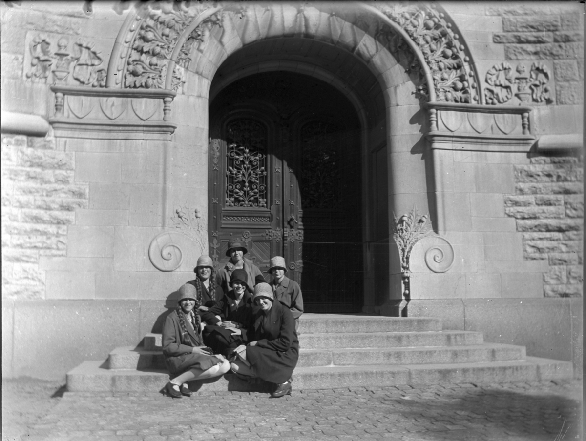 'Bildtext: ''Skolflickor.'' :: Vy av del av byggnad med en grupp, 6 flickor, iklädda hatt och kappa, sittande på stentrappa till huset. :: :: Ingår i serie med fotonr. 5228:1-11.'