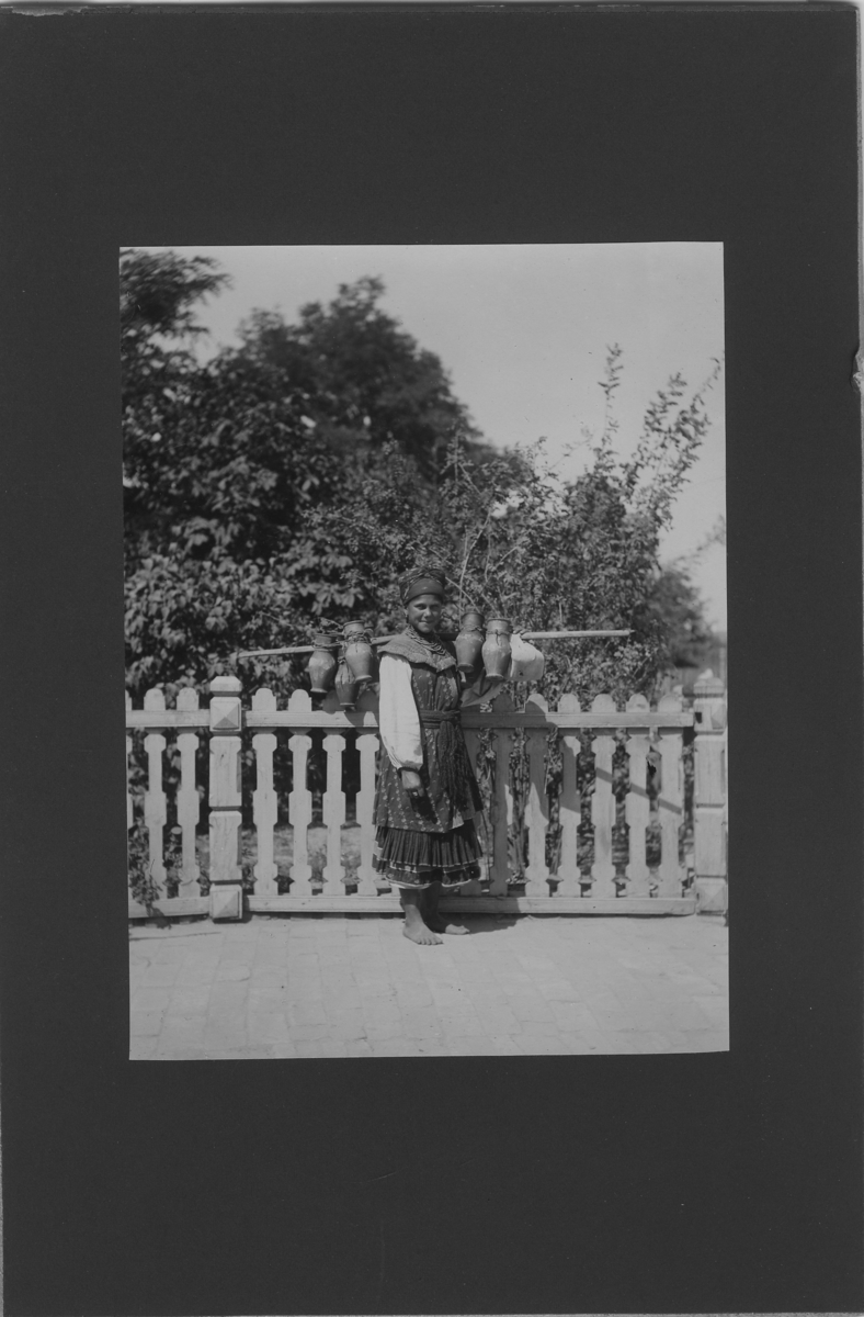 'En flicka med en käpp med lerkrus på axeln, står barfota framför ett trästaket. Kläder. Klädsel. :: Liknande bild som fotonr 5292:4 men denna flicka har broderad klänning. Helbild. :: :: Ingår i serie med fotonr. 5292:1-5. Se även hela fotonr. 5269-5292 med bilder från Stuxbergs resa till Kaukasien.'
