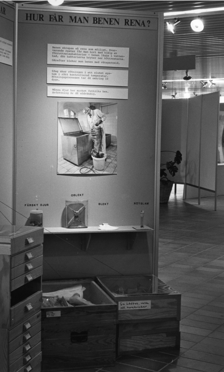 'Foto på Jubileumsutställningen, Göteborgs Naturhistoriska museum 150 år. :: :: Vy över mindre del av utställningen med utställningsskärm angående regöring av ben i centrum. Hylla med: koltrast 213 färskt djur, oblekt tumlarkota Gen.kat 1983-16.254, blekt tumlare skulderblad Gen.kat 83-16.254 Coll.au. 12.946, Vänstra lådan: Älgskelett Coll.au. 11.173, Högra lådan: Gamla Lödöse Valda nöt, hornkvicker.'