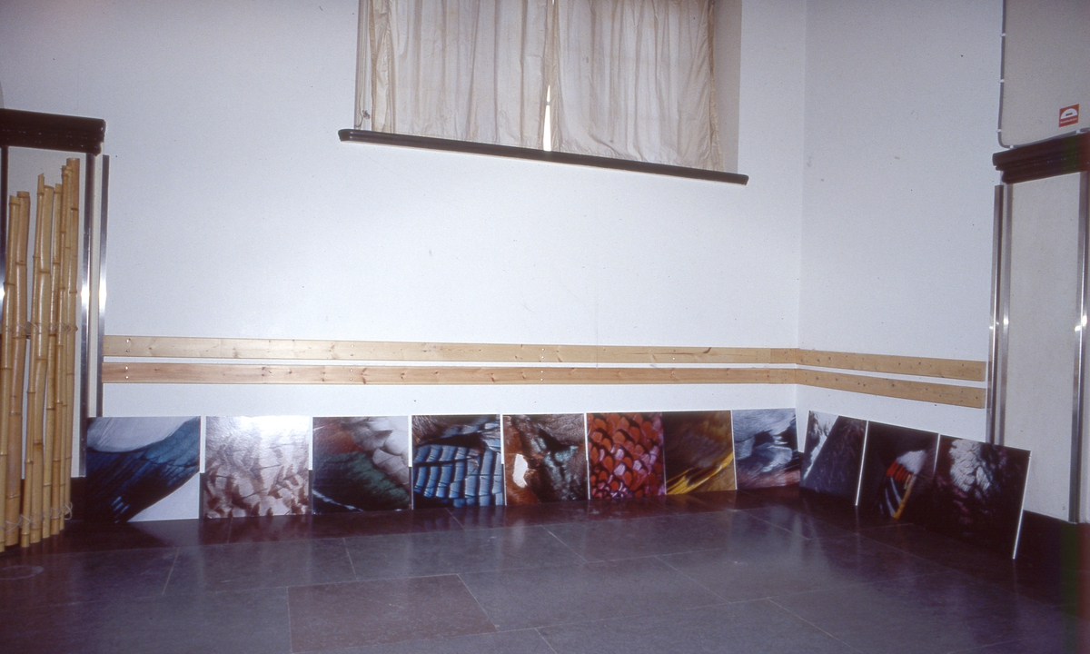 'Diverse bilder alternativt tavlor föreställande troligen detaljbilder av fåglar och deras fjäderskrudar. Tavlorna stående på golvet längs en vägg. :: :: Ingår i serie med fotonr. 6668:11-31 med bilder från temadag om burfåglar ''Fåglar hemma och ute.'''