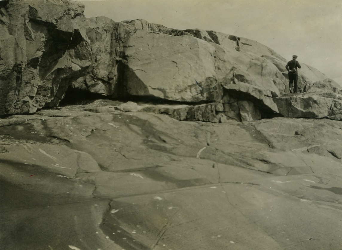 'Göteborgs Biologiska förenings utfärd till Väderöarna: :: :: Häckplats vid Stora Knappen. 1 man med ryggen mot kameran, iklädd hatt och kikare. Kala berghällar. :: Stämpel ''Naturhistoriska museet Slottsskogen Göteborg 11'' på baksidan. :: :: Ingår i serie med fotonr. 660-664.'
