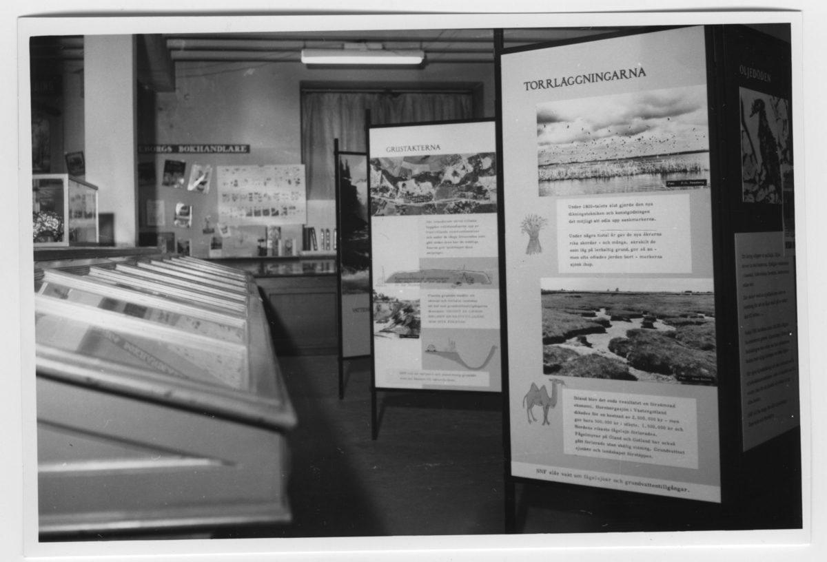 'Utställningsskärmar med titel ''Torrläggningarna'' och ''Grustäkterna'' samt även skymt av skärm med titel ''Oljedöden''. :: :: Ingår i serie med fotonr. 6983:1-22.'