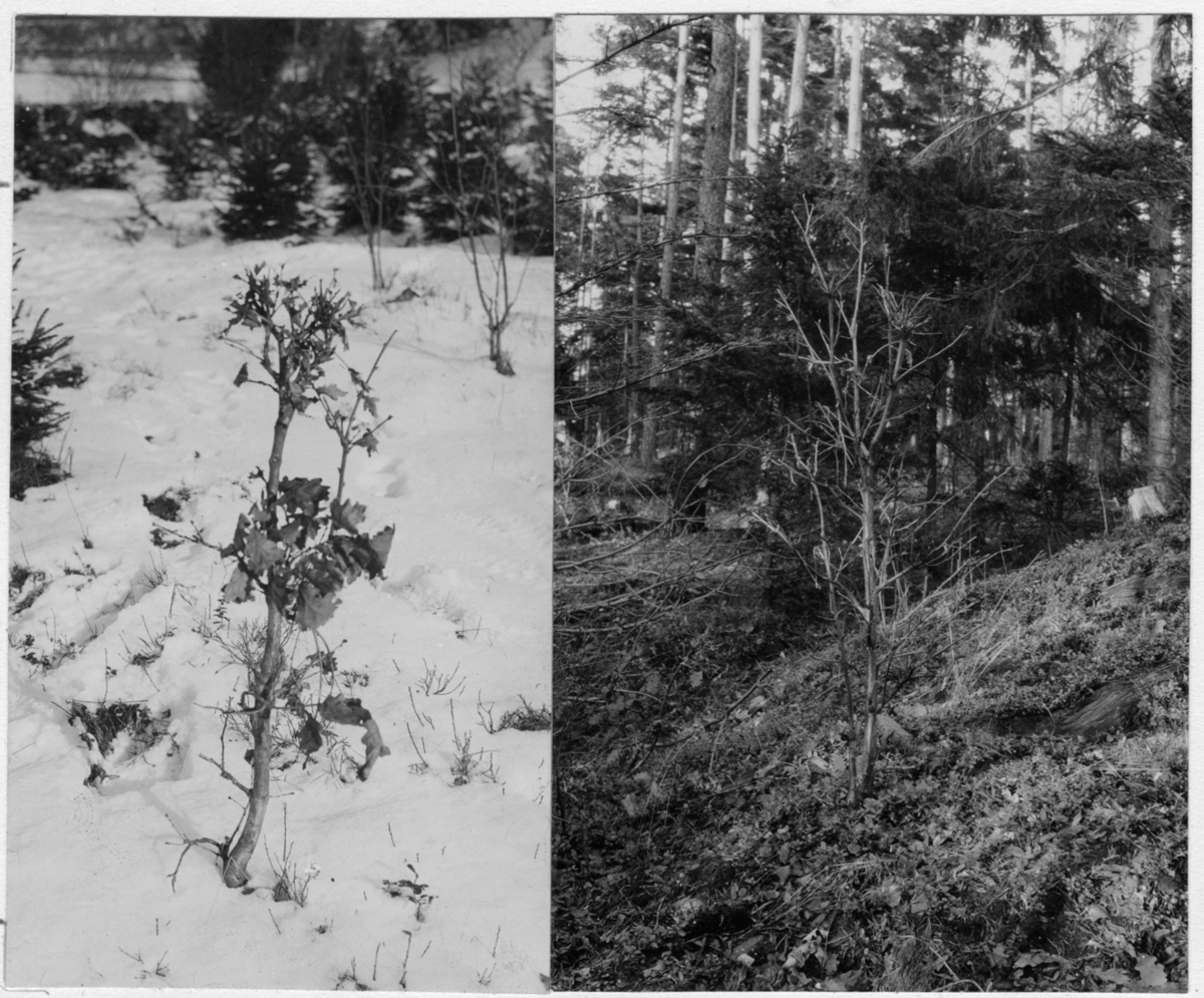 'Bildtext: ''Av kor avbetad ek och björk.'' Närbild på trädplantor. :: :: Fotonr. 7048:1-26 indelad under rubriken ''Däggdjur, Människor''. Ingår i serie med fotonr. 7046:1-383, 7047:1-33 och 7048:1-67 med bilder från Länsjägmästare John Lindners bildarkiv.'