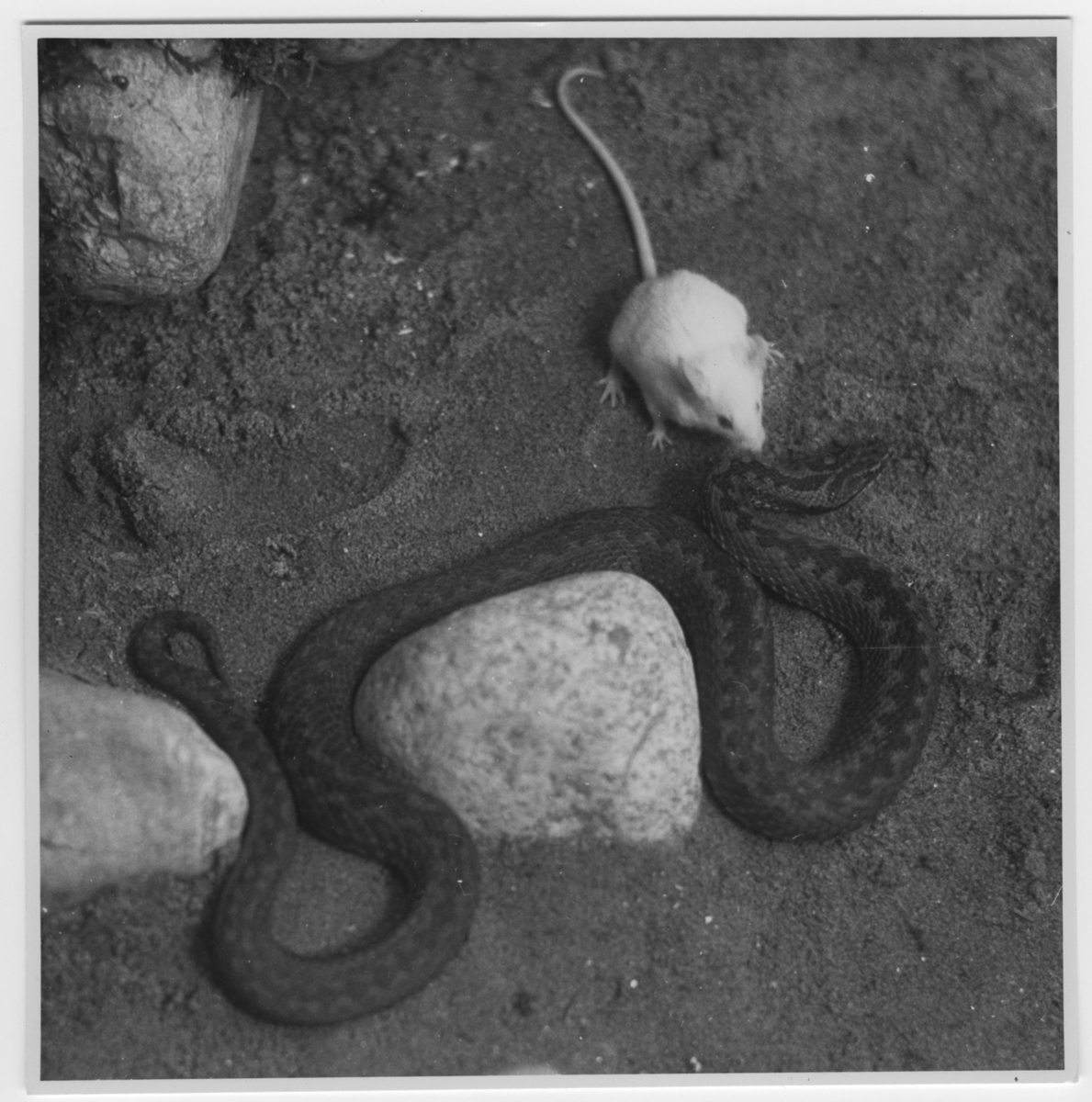 '1 st orm ligger på sanden mellan mindre stenblock, 1 st råtta sitter invid. :: :: Ingår i serie med fotonr. 4501:1-60 ur ingenjör Otto Cyréns ''Ormar i fantasi och verklighet''.'