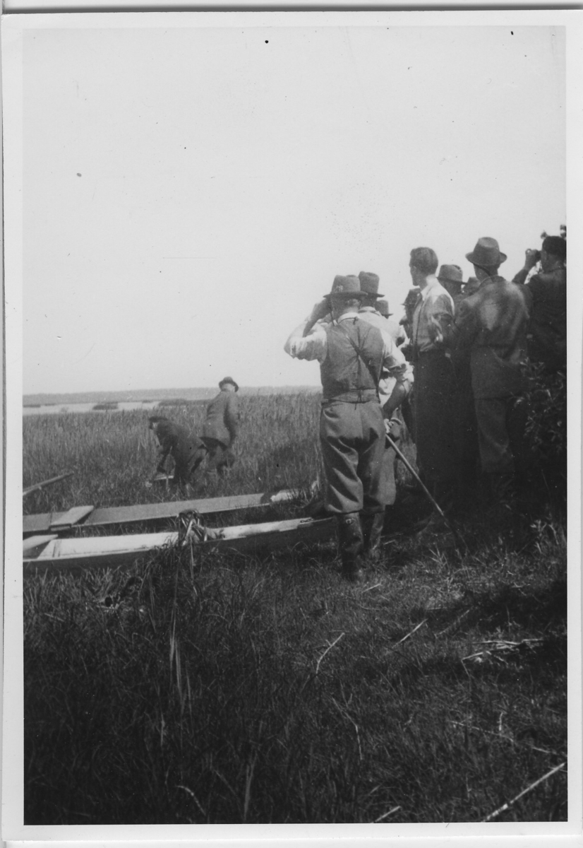 'Ingår serie 4385:1-27 från Biologiska föreningens utfärd till sjön Östen och Kinnekulle. :: :: Gruppen vid sjön Östens vatenbryn. 2 män och 2 ekor i vattnet, C.A. Frändén som fungerat som fotograf under utfärden, här i bild. Kläder. Klädsel. :: :: Text på baksidan ''På ut..ik över sjön Öster, där f. . . tmästare Frändén - den behuvade i mitten - är ciceron.'''