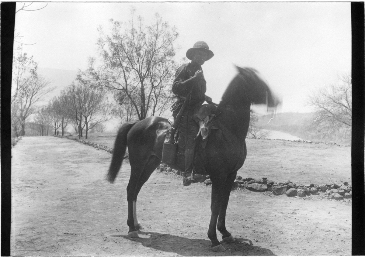 'Diverse fotografier från bl.a. dåvarande Nordrhodesia, nu Zambia, tagna av Konsul Magnus Leijer. :: :: En man sittandes på en häst som rör sitt huvud. Ekipaget stående på en grusad allé, fotograferad snett från sidan. I bakgrunden, berg och vatten.'
