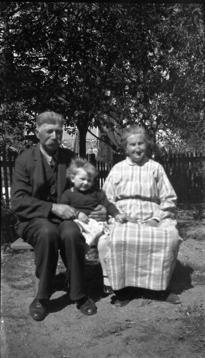 'Gruppbild med 1 man, 1 kvinna och ett litet barn sittande på träbänk i trädgård. I bakgrunden ett trästaket. Klädsel. :: :: Ingår i serie med fotonr. 5233:1-14'