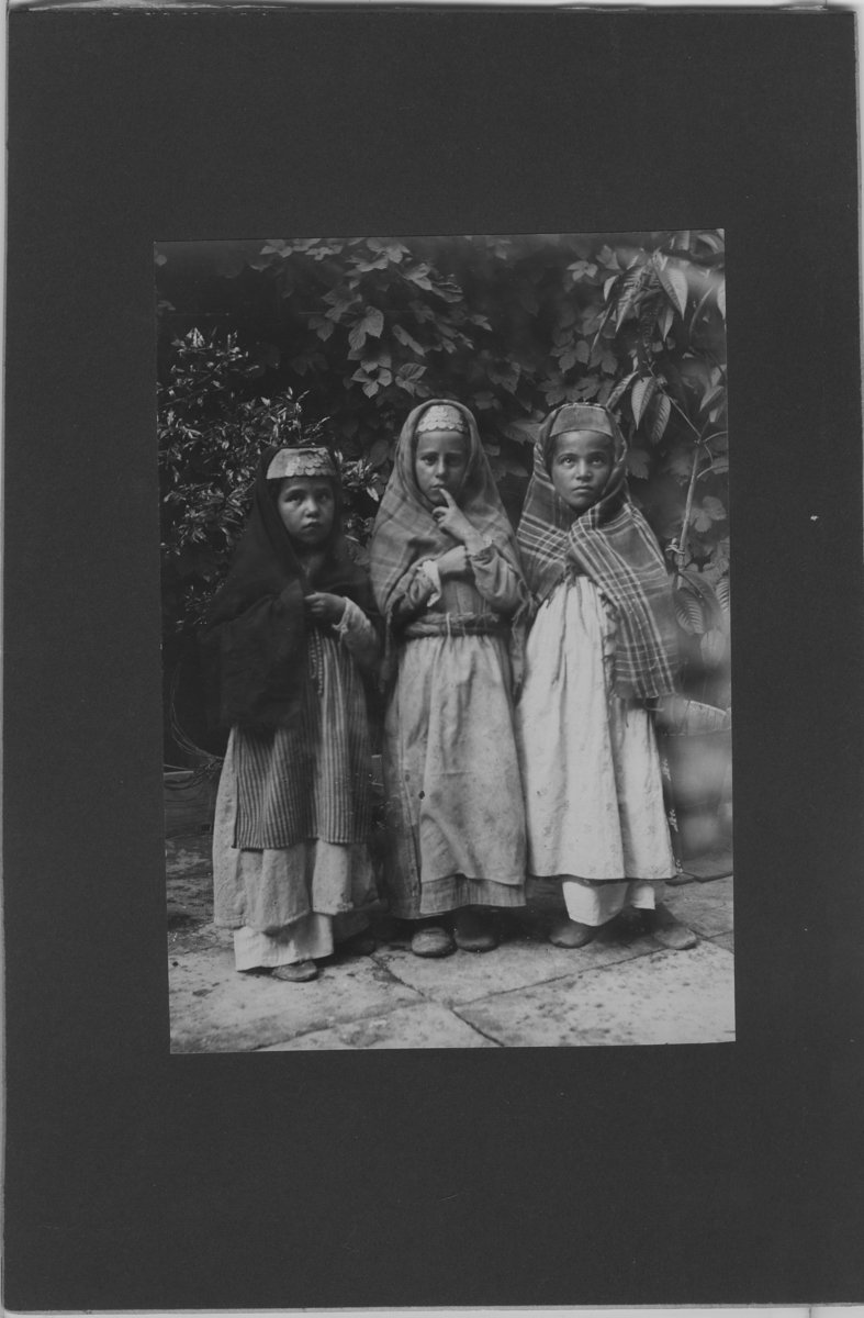 '3 småflickor uppställda för fotografering. De har långa kjolar och ''pläd'' över huvud och axlar. Kläder. Klädsel.'