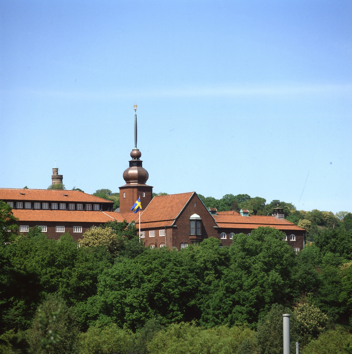'Vy med Göteborgs Naturhistoriska museum sett från Annedalskyrkan, mot entrésidan. Med flaggstång, spira och observatorietornet i Slottsskogen. :: :: Ingår i serie med fotonr. 5851:1-3.'