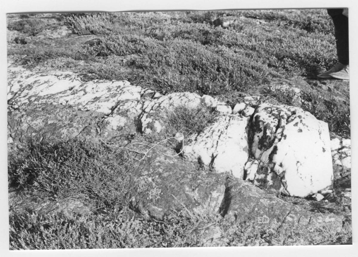 'Bildtext: ''Kvartsgång. 5-6 meter bred. Riktning 120.'' :: Närbild på del av kvartsgången (vita) med ljungvegetation. :: :: Ingår i serie med fotonr. 6970:1-1125, dokumentation av Hisingens naturgeografi, visande landskapsformerna i stora drag och gjord inför exploateringen av området. Platserna för fotograferingen finns utsatta på karta i skala 1:4000 som finns på Göteborgs Naturhistoriska musem. Fotoriktningen mättes med kompass i gammalgrader.'