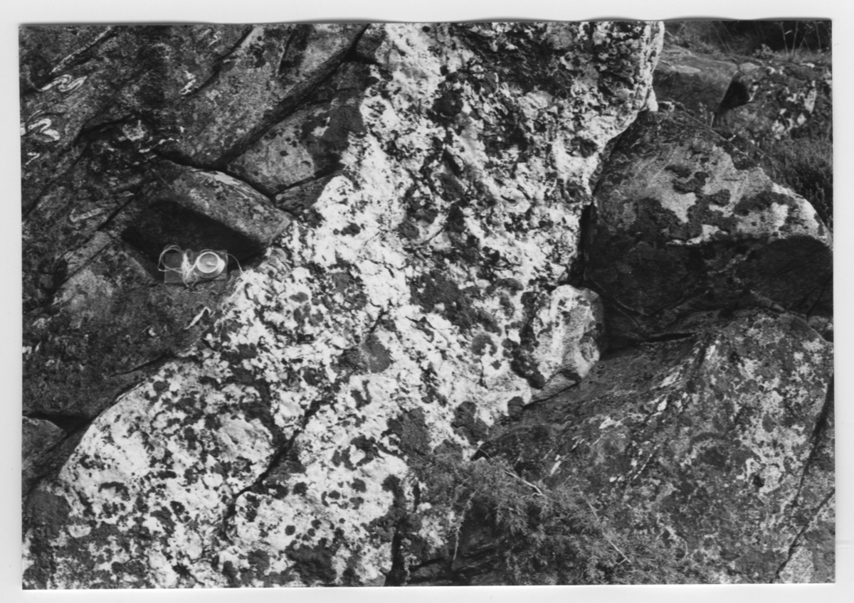 'Bildtext: ''Samma gång i skärning (som fotonr. 6970:65).'' Närbild på pegmatitgången. Se även fotonr. 6970:65. :: :: Ingår i serie med fotonr. 6970:1-1125, dokumentation av Hisingens naturgeografi, visande landskapsformerna i stora drag och gjord inför exploateringen av området. Platserna för fotograferingen finns utsatta på karta i skala 1:4000 som finns på Göteborgs Naturhistoriska musem. Fotoriktningen mättes med kompass i gammalgrader.'
