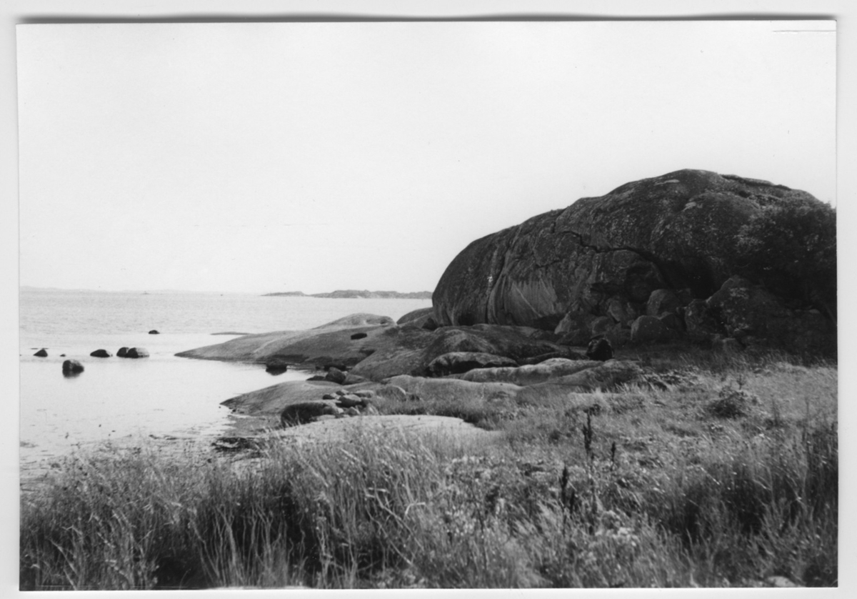 'Bildtext: ''Rundhällar med plastisk skulptur. Riktning 220.'' Rundhällar invid havsviken. :: :: Ingår i serie med fotonr. 6970:1-1125, dokumentation av Hisingens naturgeografi, visande landskapsformerna i stora drag och gjord inför exploateringen av området. Platserna för fotograferingen finns utsatta på karta i skala 1:4000 som finns på Göteborgs Naturhistoriska musem. Fotoriktningen mättes med kompass i gammalgrader.'