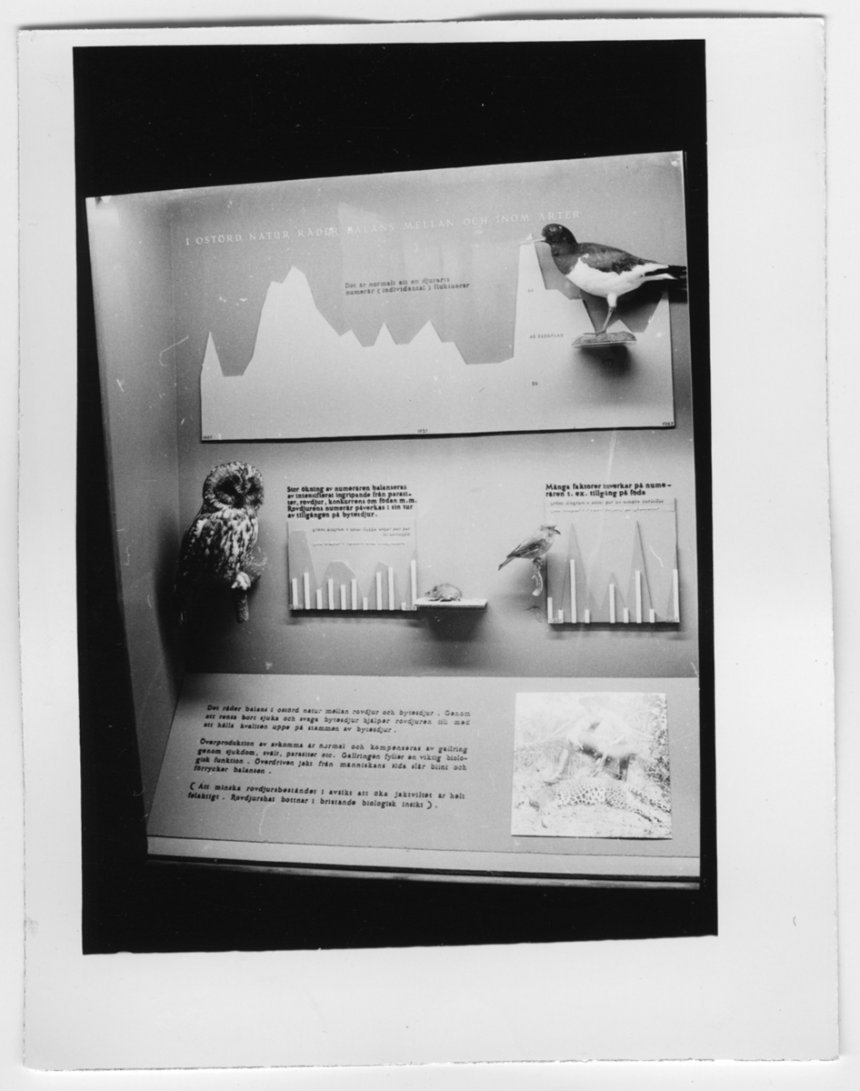 'Utställningsmonter med titel ''I ostörd natur råder allians mellan och inom arter''. Även bild på jägare som fällt byte. :: :: Ingår i serie med fotonr. 6963:1-12.'