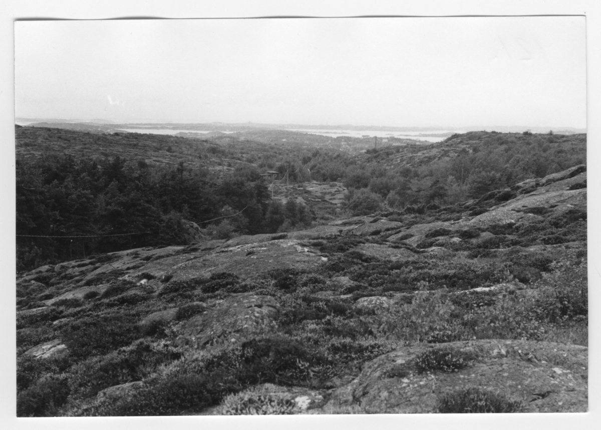 'Bildtext: ''Hällparti med vegetation i sänkorna. Riktning 248.'' Vy över berghällar med ljungvegetation och i lägre partierna trädvegetation. Litet hus/stuga. :: :: Ingår i serie med fotonr. 6970:1-1125, dokumentation av Hisingens naturgeografi, visande landskapsformerna i stora drag och gjord inför exploateringen av området. Platserna för fotograferingen finns utsatta på karta i skala 1:4000 som finns på Göteborgs Naturhistoriska musem. Fotoriktningen mättes med kompass i gammalgrader.'