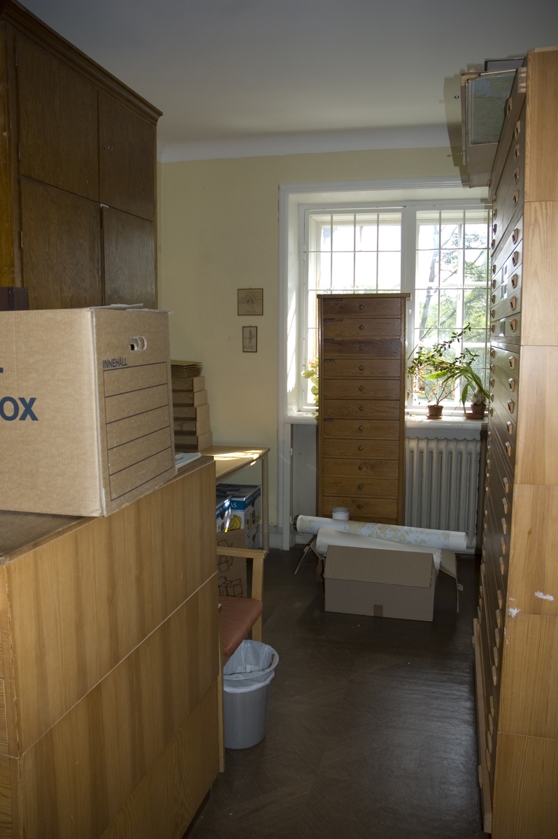 'Rummet utanför arkivet, här förvaras fotosamlingen, fotoarkivet. :: :: Fotonr. 7095 består av en bildserie som dokumenterar diverse utrymmen i byggnaden så som kontor, arbetsplatser, arbetsrum, magasin m.m. Bilder tagna före och efter olika ombyggnationer bl.a.'