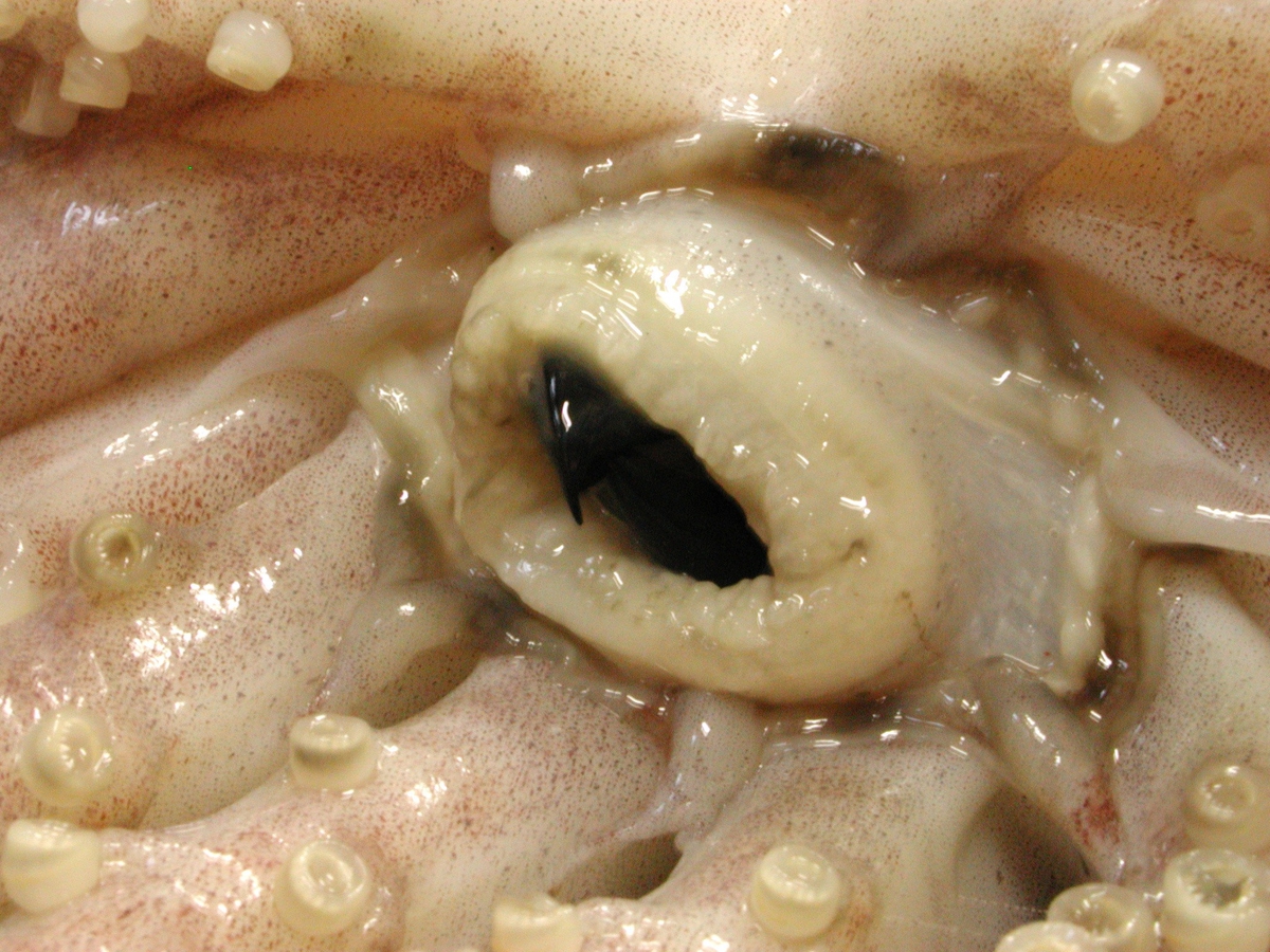 'Bilder på bläckfisken Todarodes sagittatus. Fynddatum: 2003-05-13. :: Detaljbild näbben, munnen. :: :: Ingår i serie med fotonr. 7103:1-6.'