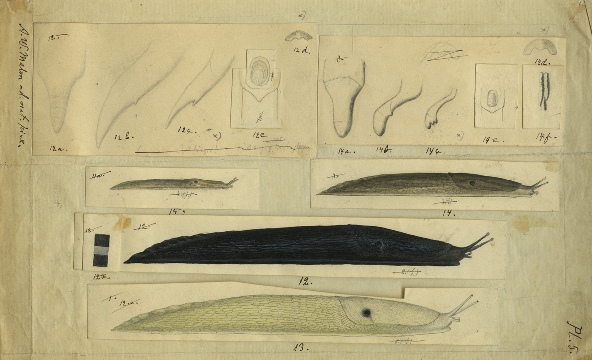 'Ark med diverse skisser, foton? och teckningar av sniglar. :: :: Ingår i serie med fotonr. 6993:1-5 med originalteckningar och foton på sniglar av August Wilhelm Malm.'