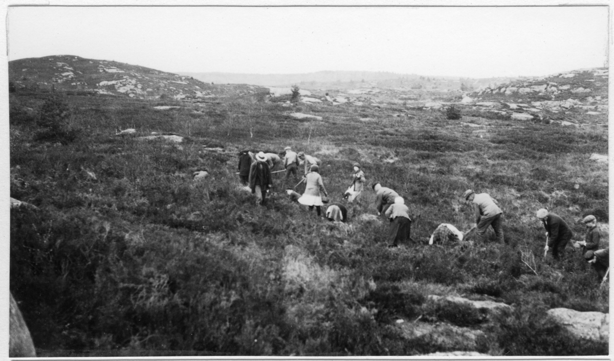 'Bildtext: ''Skogsplantering.'' Vy med en grupp, ca 15 st, kvinnor och män i arbete i skogsplantering. :: :: Fotonr. 7046:307-328 indelade som ''Skogsodling och självsådd.'' Ingår i serie med fotonr. 7046:1-383, 7047:1-33 och 7048:1-67 med bilder från Länsjägmästare John Lindners bildarkiv.'