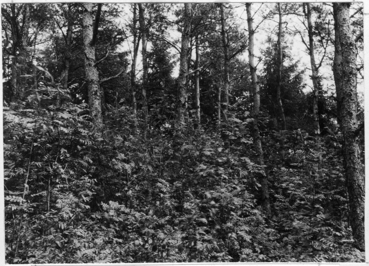 'Bildtext: ''Bild 186. Planterat tallbestånd med tät underväxt av rönn genom koltrastars och något ek genom nötskrikors medverkan.'' Närbild på tallar med underskikt av rönn. :: :: Fotonr. 7046:307-328 indelade som ''Skogsodling och självsådd.'' Ingår i serie med fotonr. 7046:1-383, 7047:1-33 och 7048:1-67 med bilder från Länsjägmästare John Lindners bildarkiv.'